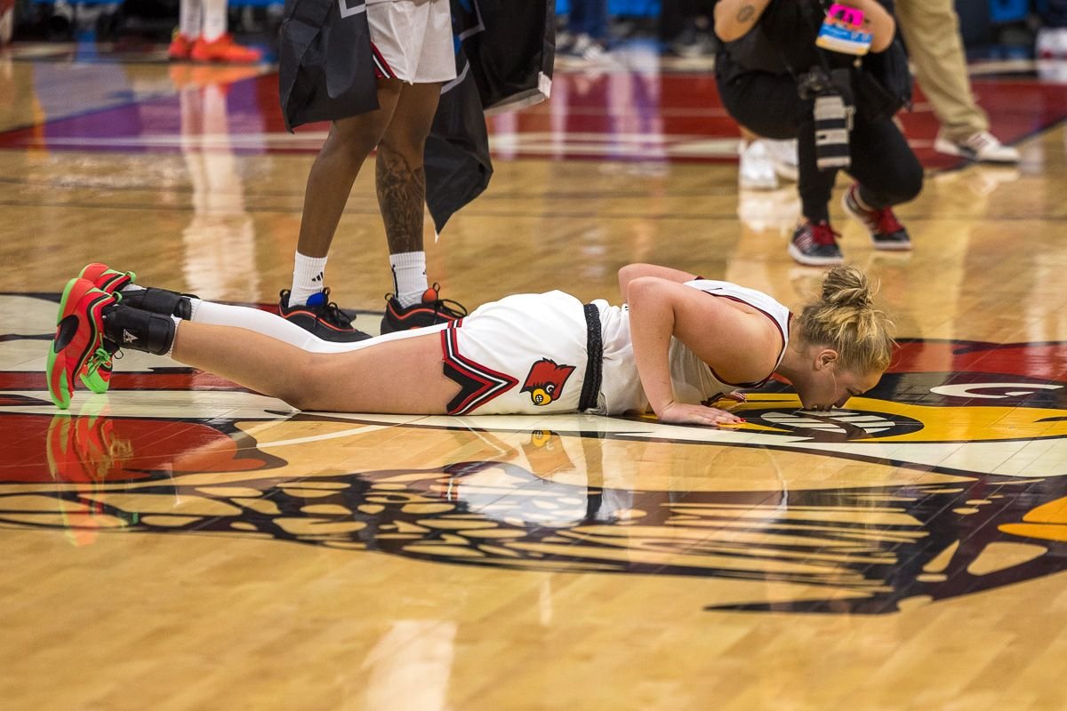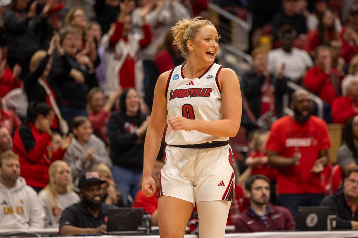 Laura Ziegler personifying this team’s love for the program, kneeling down to kiss the Cardinal logo after the victory. She transferred from St. Joseph’s to compete in an NCAA tournament and is enjoying every minute of her participation. Tears of joy after the win, donning an NCAA flag for lap around the court and still more tears in the post-game press conference. She love her teammates and considers Louisville a second home. One of the most popular one-year players in UofL history.