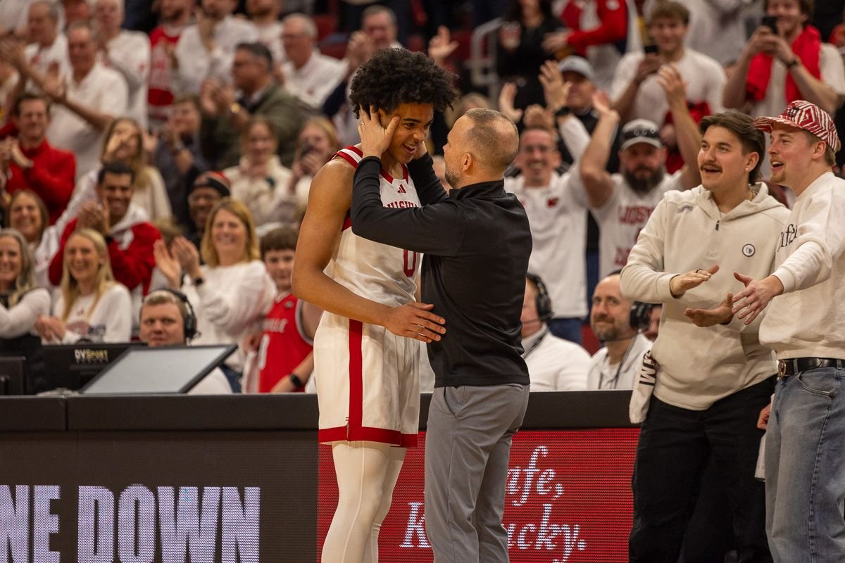 Coach Pat Kelsey shows his appreciation to his star-studded freshman on a breakout night (Mike DeZarn photo).