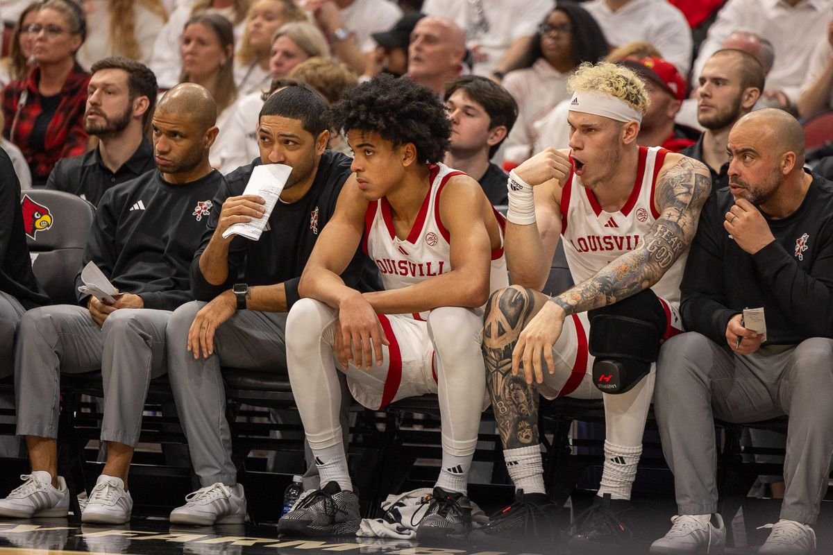 Peyton Siva with some advice for Mikel Brown during a brief stint on the sideline (Mike DeZarn photo).
